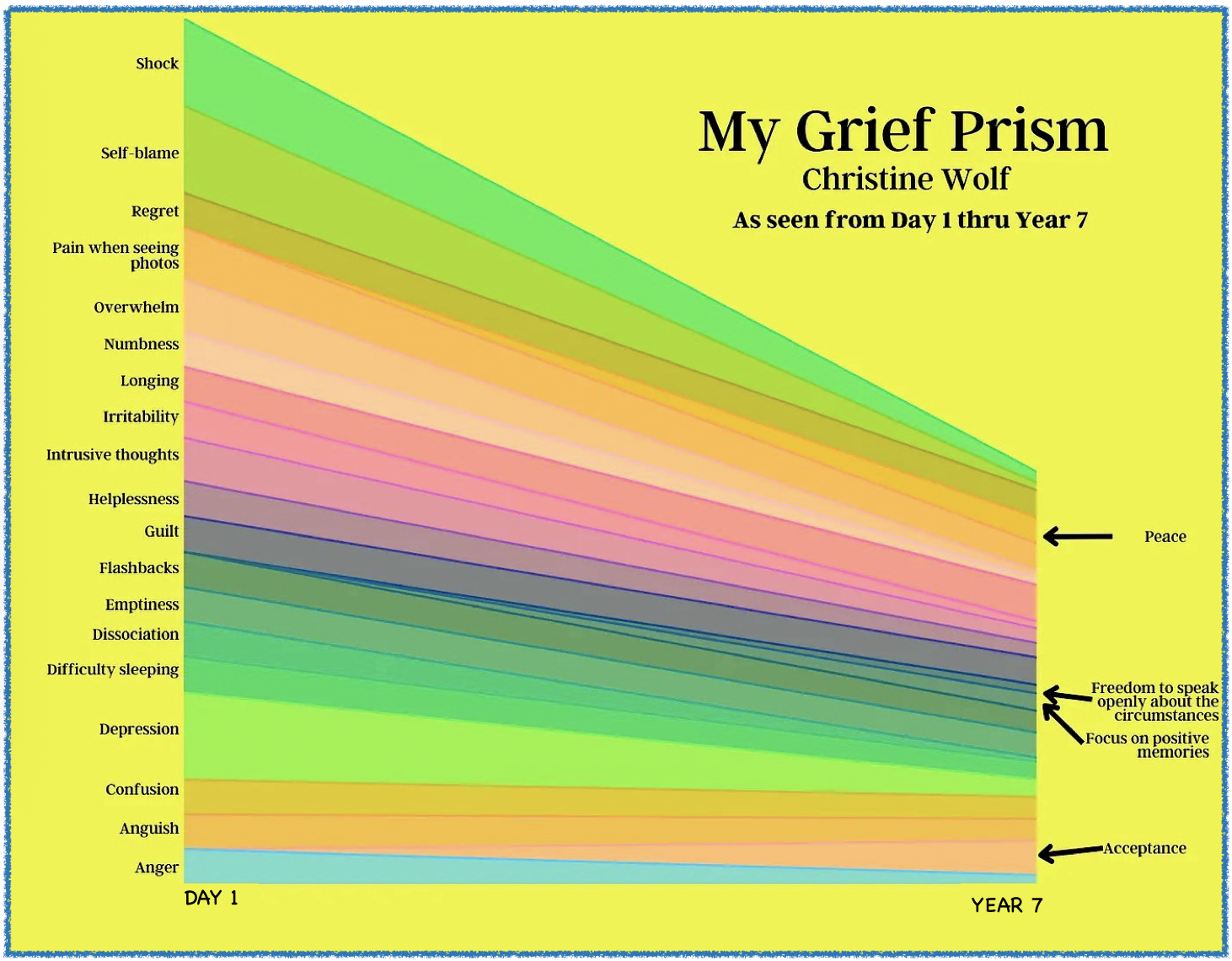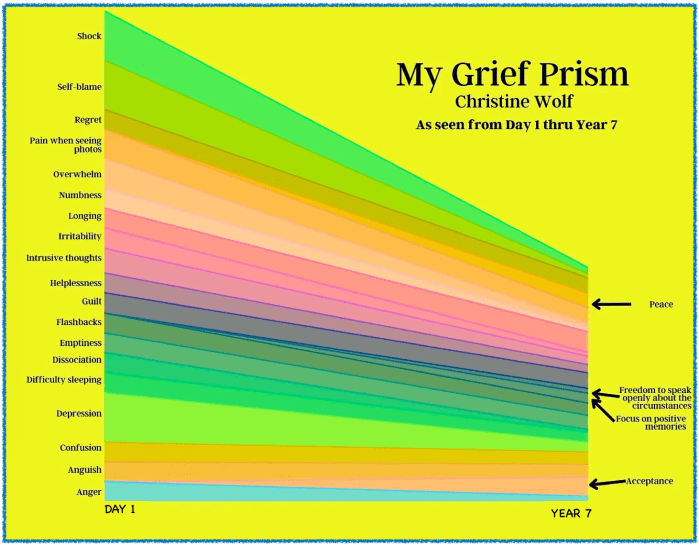 This chart is a personal way to color the emotions & experiences of grief (More….) :