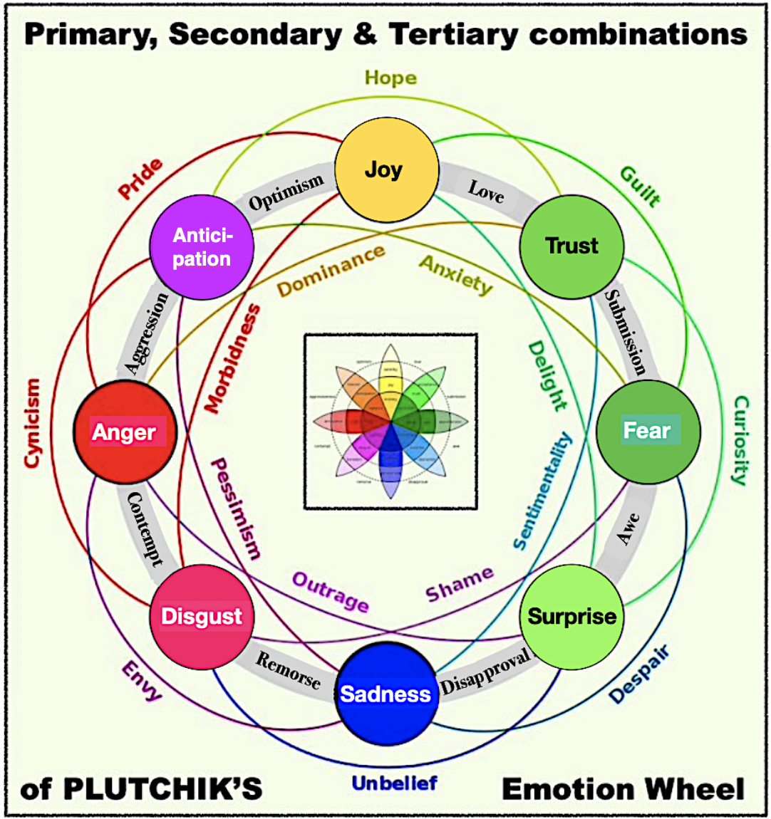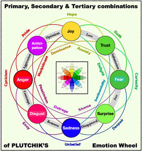 3 primaries are red, yellow, blue. All others are combinations. Amazingly, this matches the way our emotions are structured.