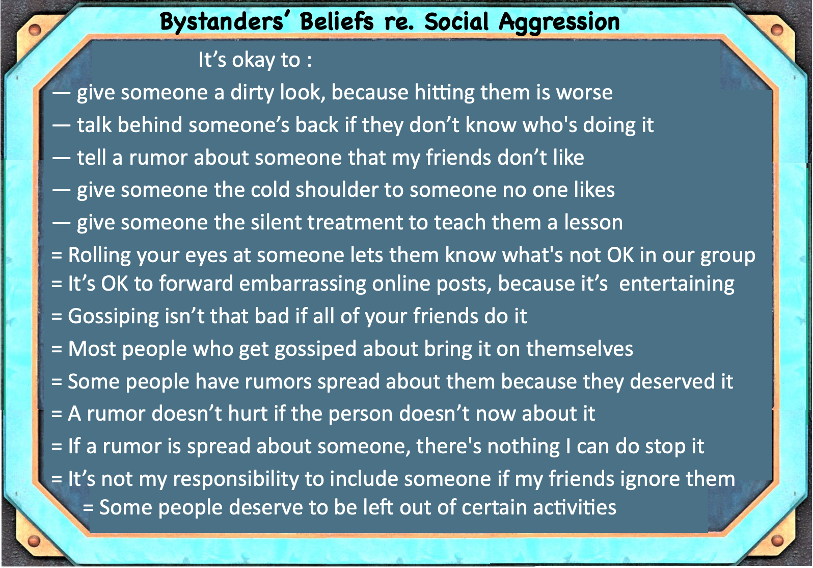 The list below represent some beliefs (cognitive mechanisms) of Morally Dis-engaged bystanders, similar in both cyber- or in-person bullying.