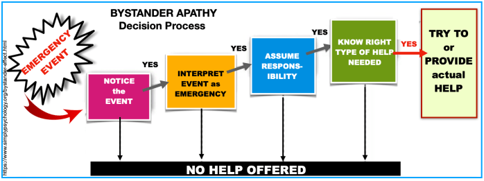 The “Bystander Effect“, also called Bystander APATHY, is made up of several components