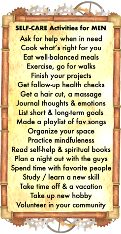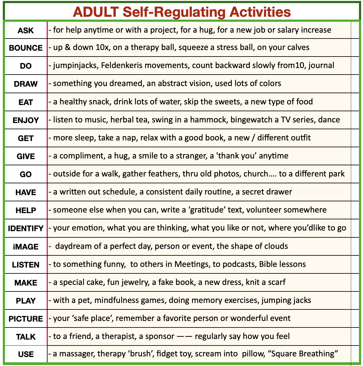 A variety of activities are needed to help us acknowledge & regularly express emotion – in appropriate ways. S-C includes having safe people to unburden ourself to who are empathetic without trying to fix us. Another ‘tool’ can be to make time for leisure activities that allow us to relax & process our emotions.