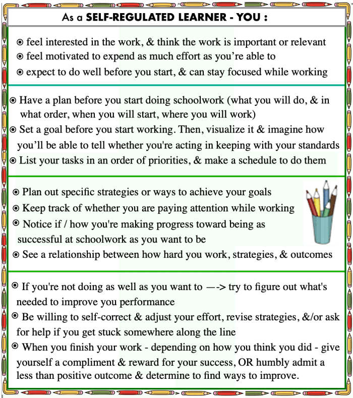 2. Monitor: Reflect on how effective certain locations or strategies are when studying, think about what to do when obstacles arise, & determine how good one’s understanding of the content is. They respond positively to feedback about how they’re doing academically